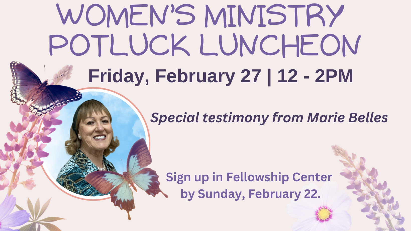 The Women's Ministry has a monthly luncheon happening on Friday, February 27 from 12-2pm in the Fellowship Center. There will be a special testimony from Marie Belles. Sign up in the Fellowship Center by Sunday, February 22.