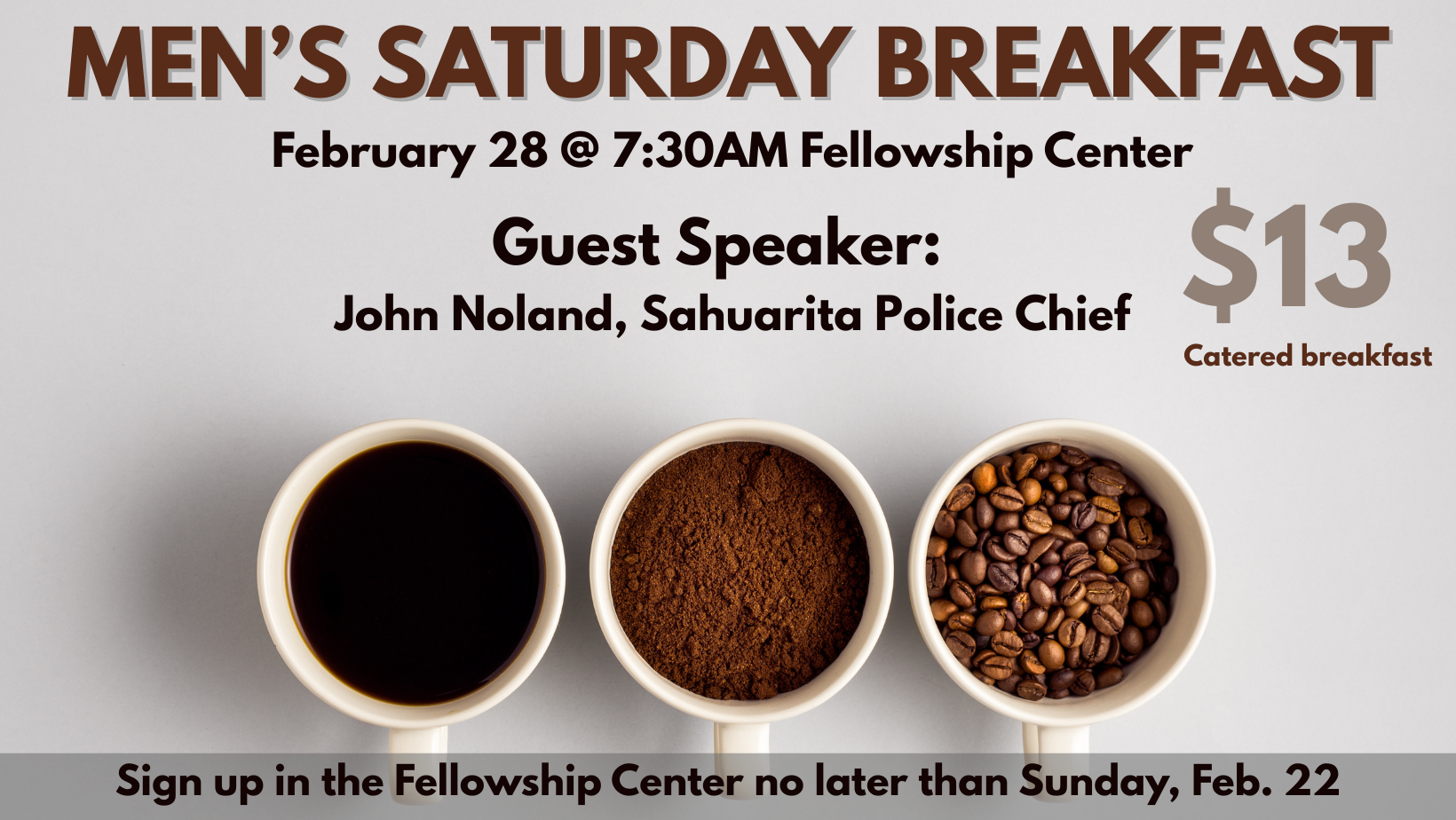 The next Men's Breakfast will be on Saturday, February 28 at 7:30am in the Fellowship Center. The guest speaker will be Sahuarita Police Chief John Noland. Cost is $13 for a catered breakfast. Sign up in the Fellowship Center by Sunday, February 22.