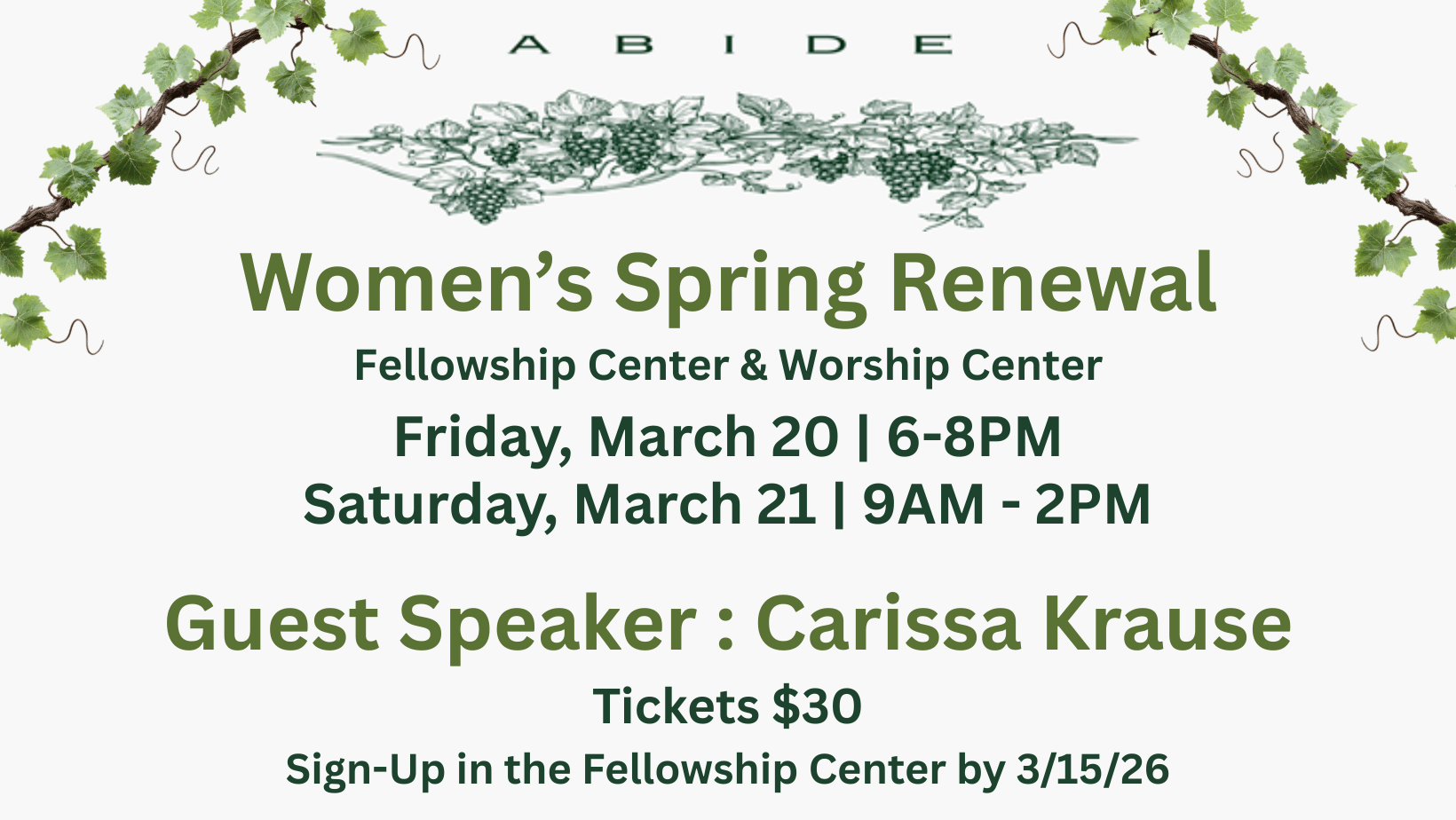 The Women's Spring Renewal is Friday, March 20 & Saturday, March 21. The Guest Speaker is Carissa Krause. Cost is $30. Register in the Fellowship Center.