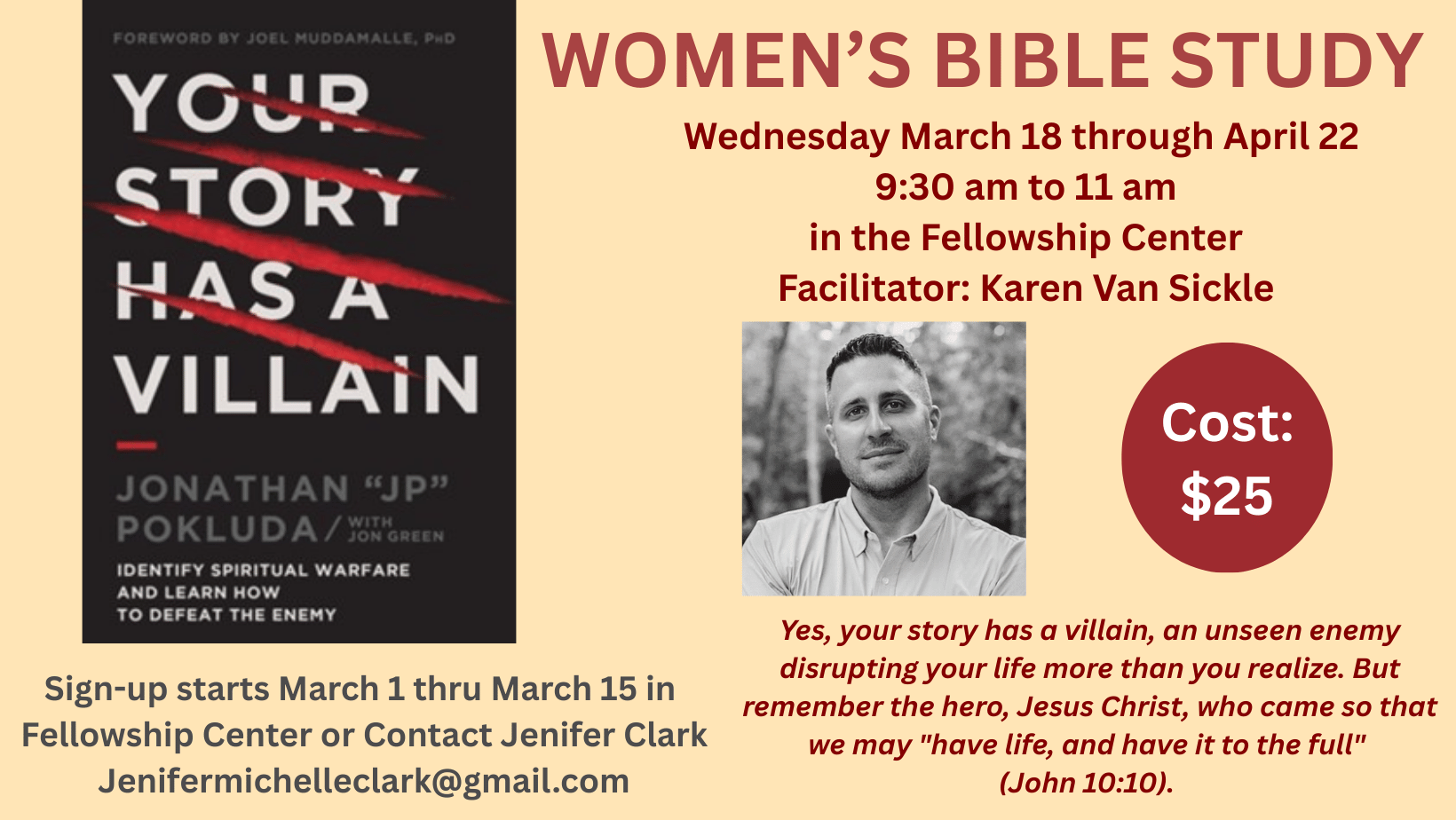 New Women's Bible Study starting March 18 - April 22. Sign up in Fellowship Center. Cost is $25