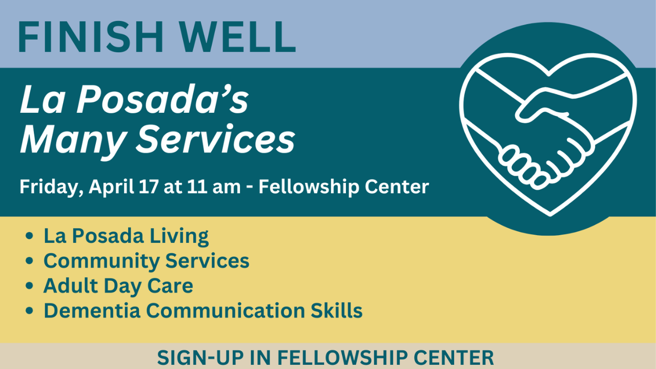 The next Finish Well event is about La Posada and all the services they offer. Join us on Friday, April 17 from 11AM - 12:30PM. Sign up in the Fellowship Center.