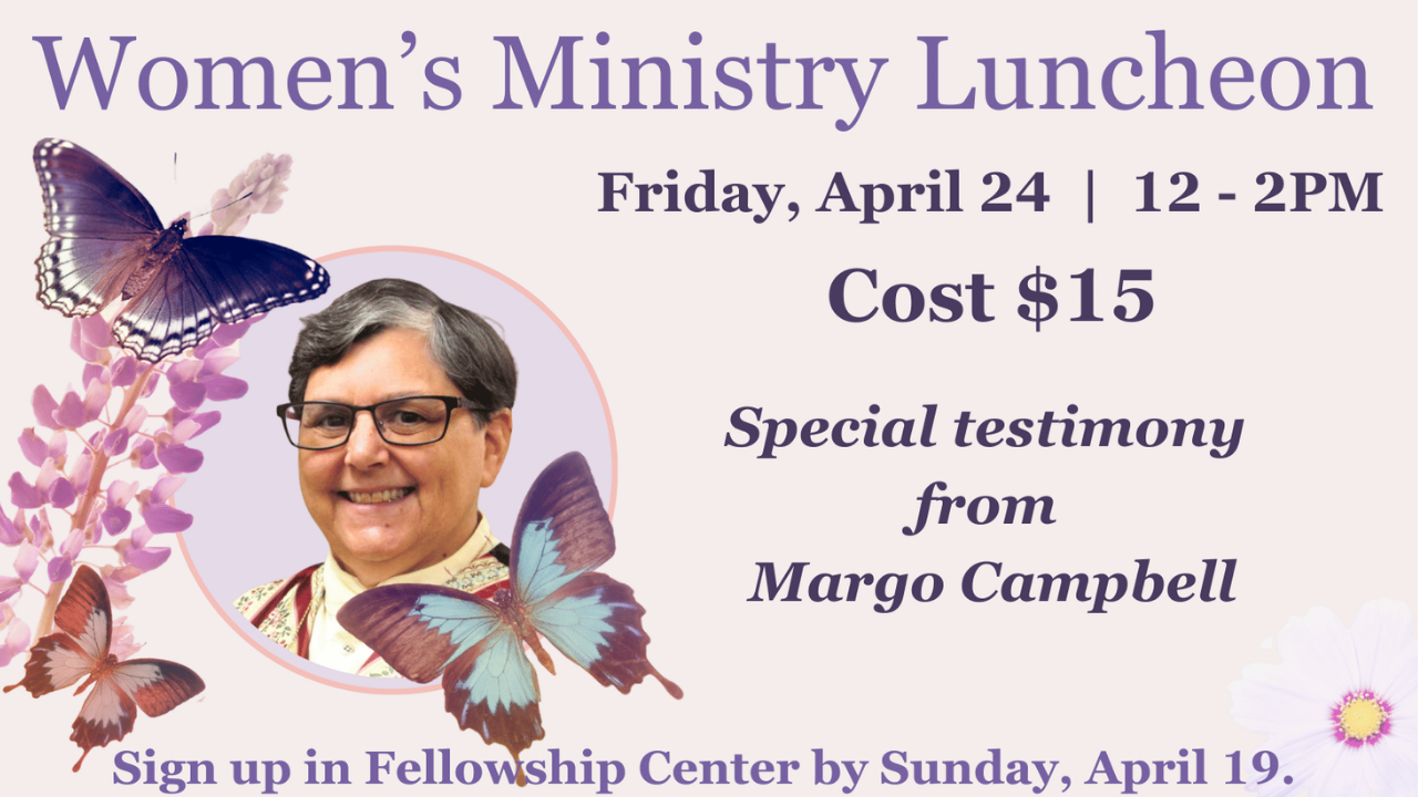 The next Women's Luncheon is Friday, April 24 from 12 - 2PM. This is a catered lunch and tickets are $15. Sign up and purchase tickets in the Fellowship Center by April 19.