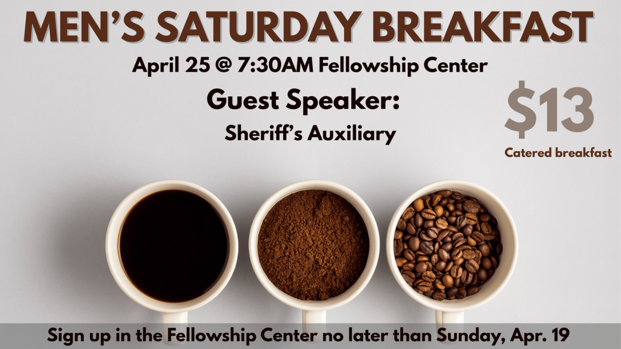 The next Men's Breakfast is Saturday, April 25th at 7:30AM in the Fellowship Center. Special guest speaker will be the Sheriff's Auxiliary. Tickets are $13. Sign up in the Fellowship Center by April 19.