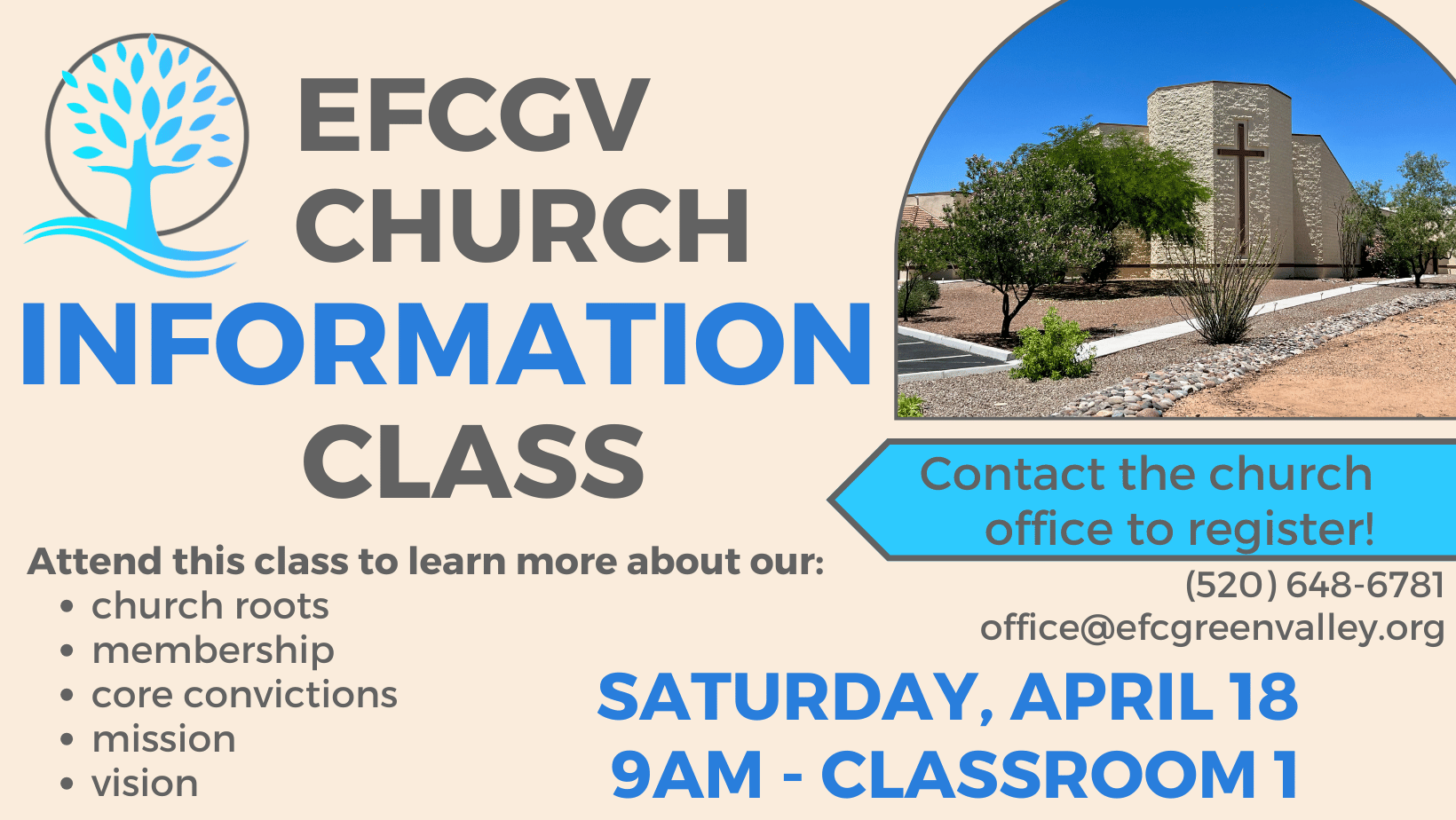 Want to learn more about EFCGV? Join us for our next Information Class on Saturday, April 18 from 9 - 11:30 AM...there will be snacks! Reach out to the office to register or ask any questions. office@efcgreenvalley.org