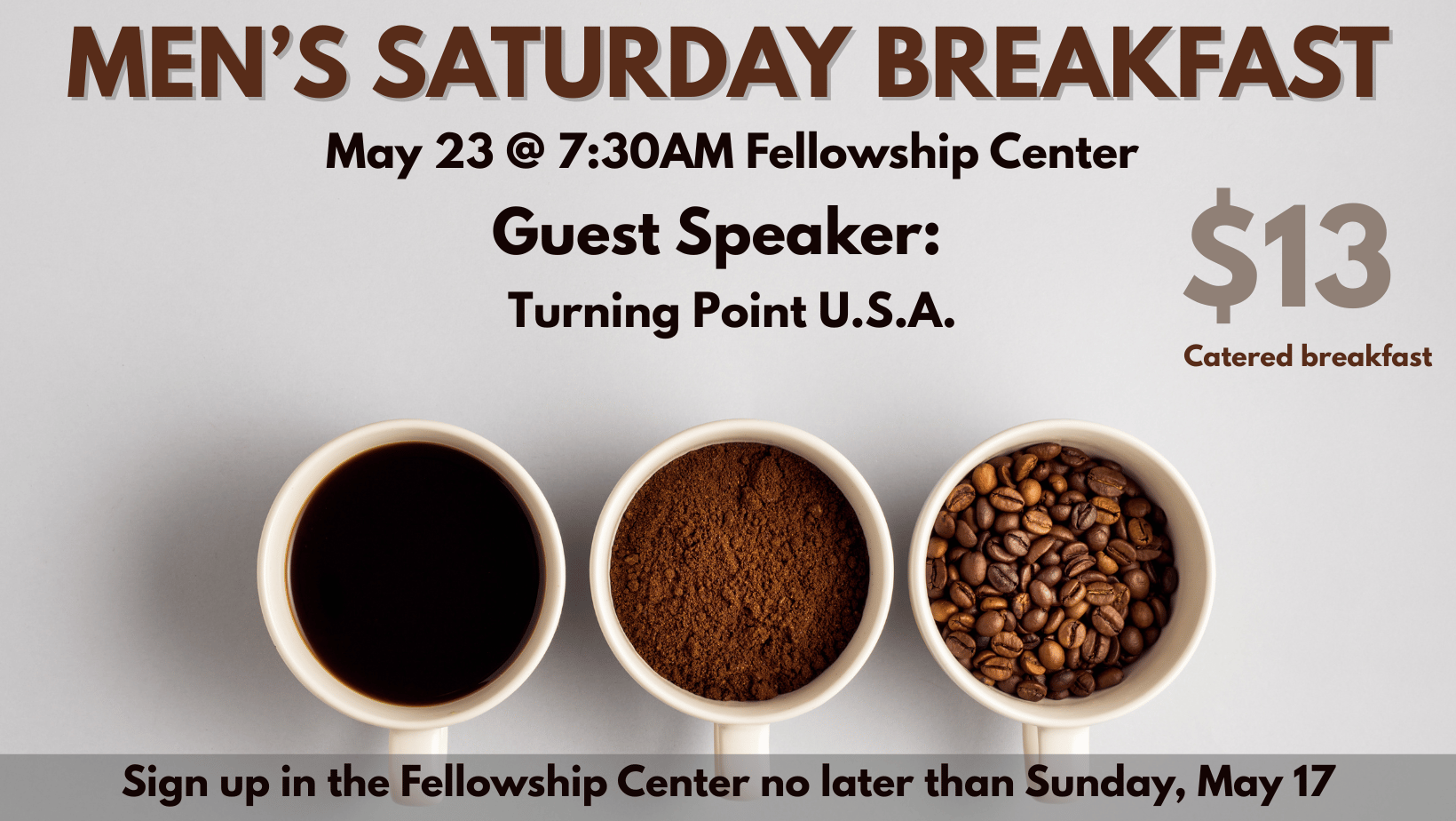 The Men's Ministry holds a Men's Breakfast on the fourth Saturday of the month. The cost for this catered breakfast is $13. To sign up, please visit the Fellowship Center.