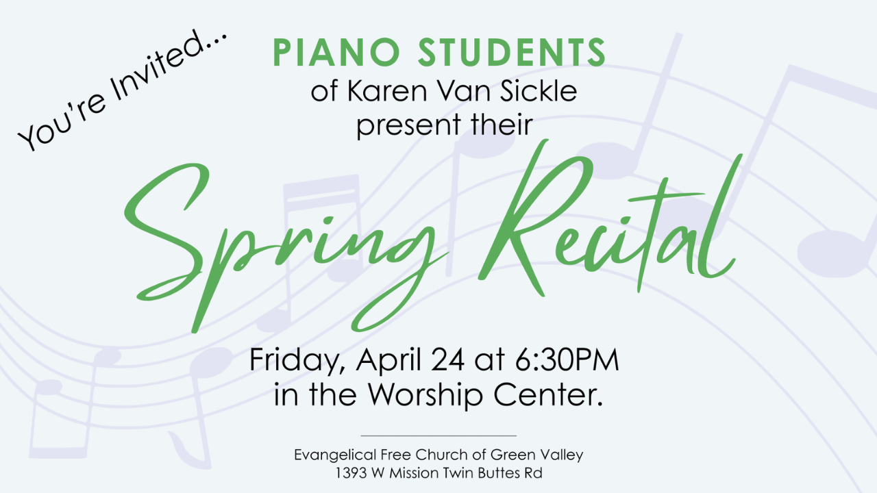 The piano students of Karen Van Sickle are holding a piano recital on Friday April 24 at 6:30PM in the Worship Center. There is no cost; come enjoy the musical stylings of students of all ages.
